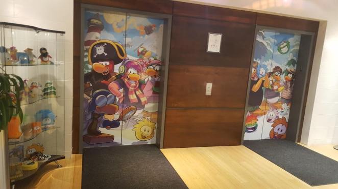 I always do enjoy seeing the contrast between the older and modern art-styles. Along with those two designs, there were a couple more in the Kelowna HQ as well. For example, this elevator design depicted a variety of penguins having a fun time!