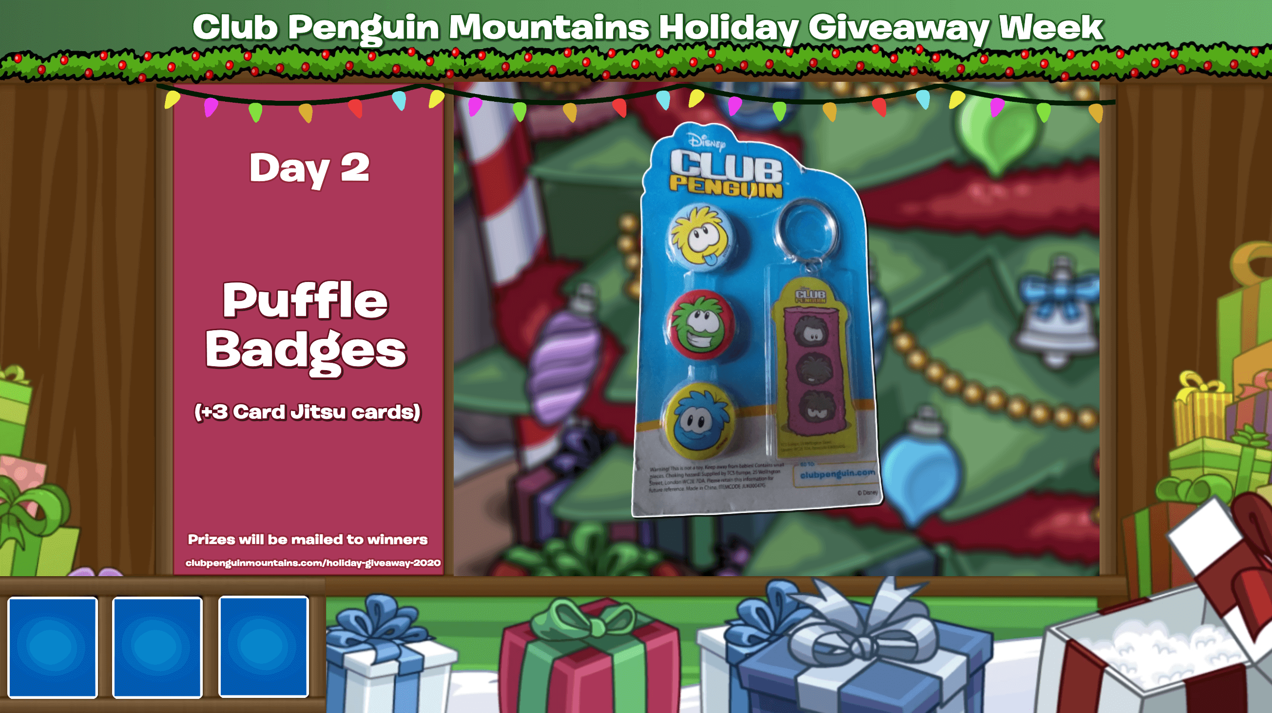 For the third year in a row, Club Penguin Mountains hosted a series of giveaways for different pieces of merchandises in December 2020. There were seven different prizes up for grabs, but sadly, all of the giveaways have concluded!